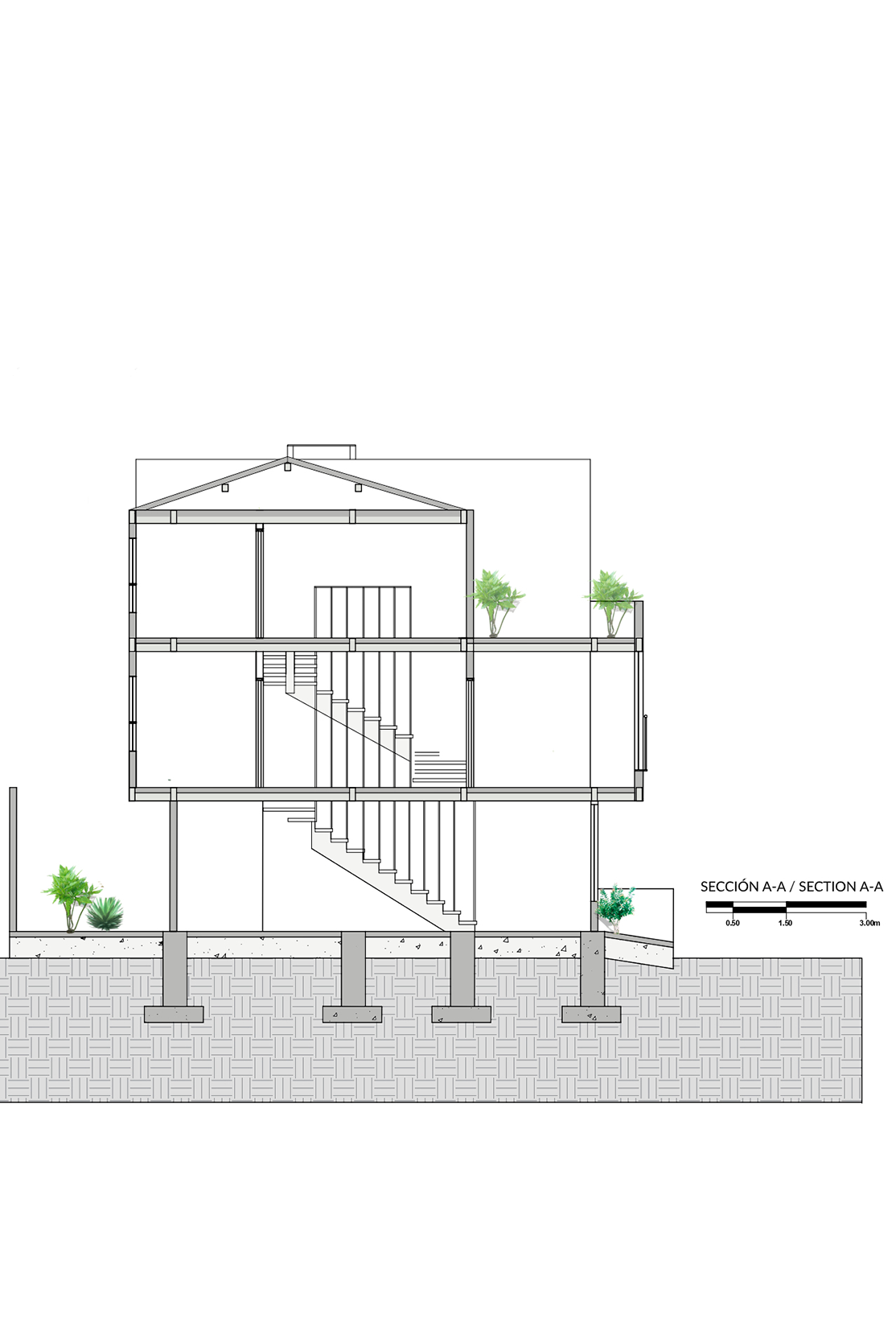 Casas El Vergel es un proyecto de vivienda bifamiliar. Para cada vivienda se destinan 4m de frente, y 12,5m de profundidad, por lo cual el aprovechamiento del espacio es la prioridad, esto se logra con una primera planta libre o abierta, en la que se disponen sala, comedor y cocina en un mismo espacio. En las plantas superiores se distribuyen las habitaciones, a las cuales se accede por medio de una escalera lineal con escalones ligeros en madera para aliviar la carga visual del espacio.